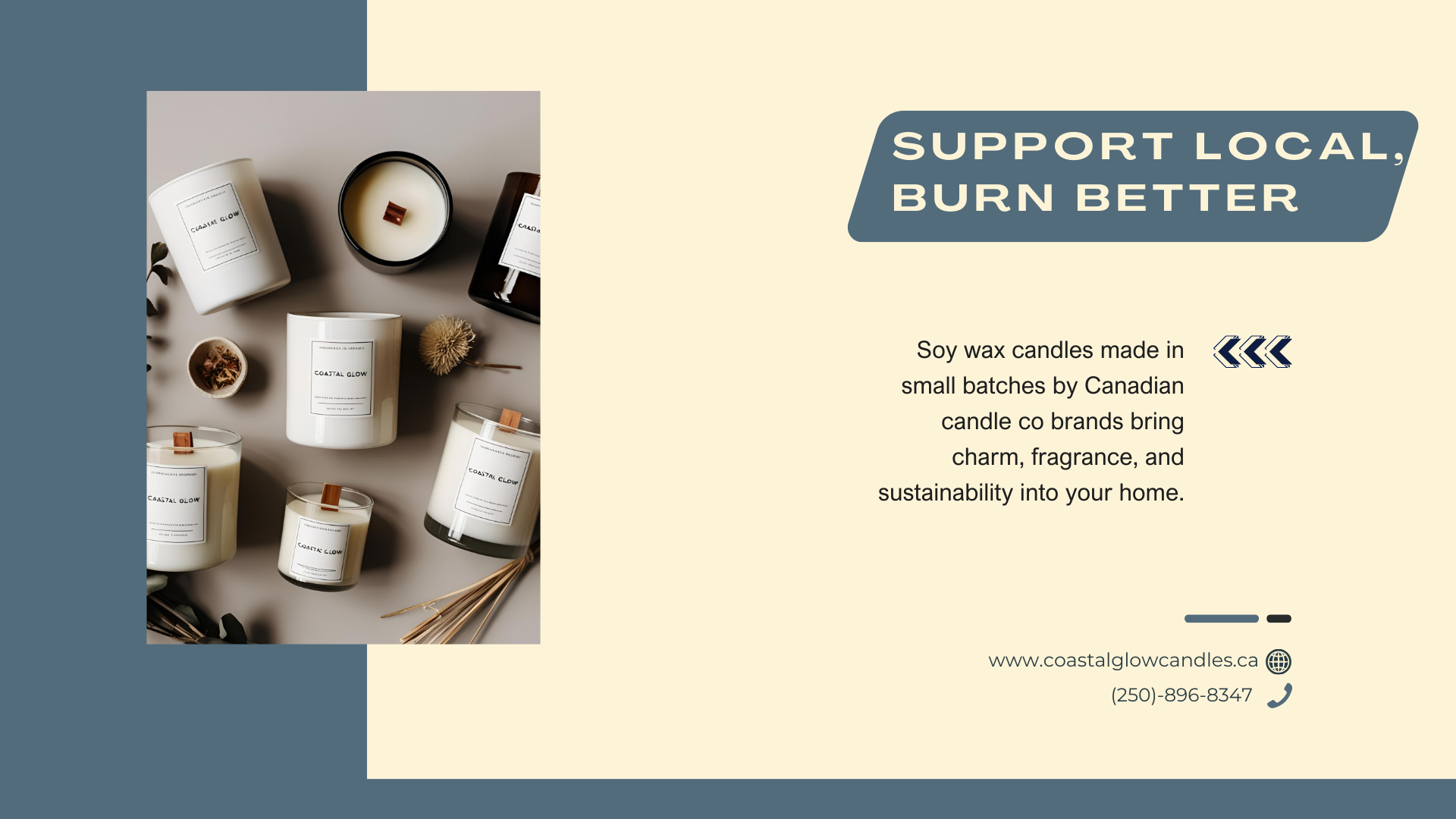 Based in Sooke, BC, I offer local delivery and in-store pickup for those nearby. Coastal Glow’s wax candles are hand-poured in small batches, using sustainable ingredients, fragrance oils, and cotton wicks or wood wicks for a unique burn experience.